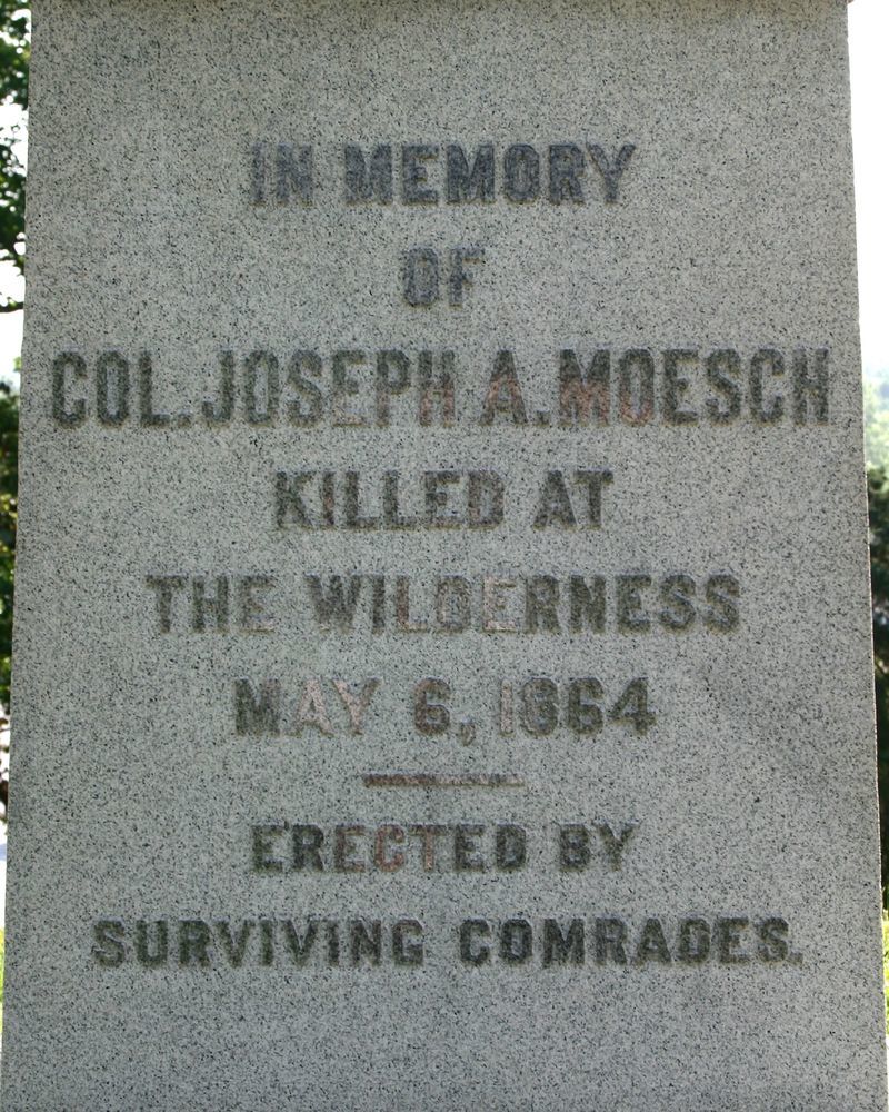 Erected by surviving comrades of the 83rd New York Volunteers to the memory of those fallen and to their Colonel, Joseph Moesch, on whose grave this monument rests. Moesch died in battle during the Wilderness campaign. || 6'H Mn in National Cemetery w/ 48"Lx48"Wx9"H rough-cut, tooled edge base, monlithic shaft tapering to pyramidal top w/ rough-cut banding. Polished faces w/ raised lettering. Circular bronze plaque at W w/ Regiment & Corps insignia.