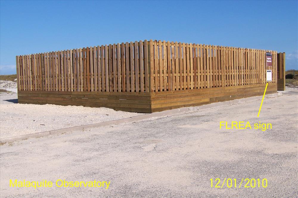 These photos show the recently built Malaquite Observatory. The observatory was built in response to a need to protect the telescopes used by amateur astronomers at star parties held at the park from the elements, which include wind, saline sprary from the nearby Gulf of Mexico, and the glare of headlights of visitors coming to attend the star parties. To combat these problems the park built this observatory, which has (1) a wall/fence made of closely-placed alternating slats to break up the wind (to minimize stress on the structure), but minimizing headlight glare (2) a concrete foundation to provide a steady support for the telescopes (3) benches placed around the inside perimiter for the comfort of people waiting to peer through the telescopes. Minor modifications will soon be made to allow some slats to be removed to allow telescopes to view objects lower than the top of the wall and a white section of the inner wall to act as a screen for slide shows. This facility will also be used during daylight hours as a teaching area for environmental education programs.