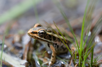 A brown, green, and black frog sits in the water at Sandbank Stream near a tuft of grass. The background is blurry, and the frog's eye is in focus.