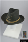Civil War uniform hat. Black felt. Two crossed swords made of metallic gold thread at front center. Insignia for First Massachusetts Cavalry. Brim trimmed with two bands of braided gold metallic thread. Knotted at front. Leather band around inside brim.<CRPart of Charles Appleton Longfellows Civil War uniform. See LONG 13273-13275, 14046-14055 (uniform).'