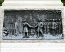 The 8' x 8' x 10' tiered Barre, VT, granite base supports a 6'6" bronze statue of a private soldier at parade rest. Four bronze panels are set into the base. The total height of the monument is 16'5".
