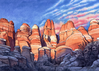 watercolor illustration of red-orange and white sandstone towers at sunset