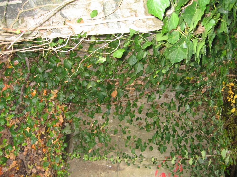 View of Springhouse at Glover-Archbold Park in Washington, D.C.. One of four contributing resources to the National Register listed park. Picture taken in November 2007 showing damage to structure from invasive vegetation, vandals, and deferred maintenance.