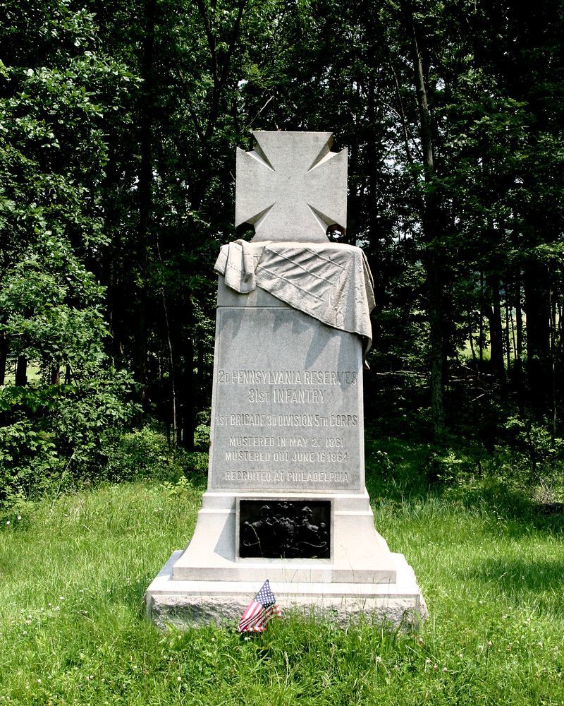 Marks position of 2nd Pennsylavania Reserves on July 2, 1863 after counterattack on advancing Confederates. 1 of 110 mns in Park to PA commands at Gettyburg. Located on E side of Ayres Ave on E edge of Wheatfield. || Mn & 2 flank markers. Rough hewn base, 5' sq. Shaft, 3' sq. Apex-cap topped w/ draped flag & V Corps Maltese Cross. All 9'3" high. Flank markers, apex topped, 1'x1'x8".