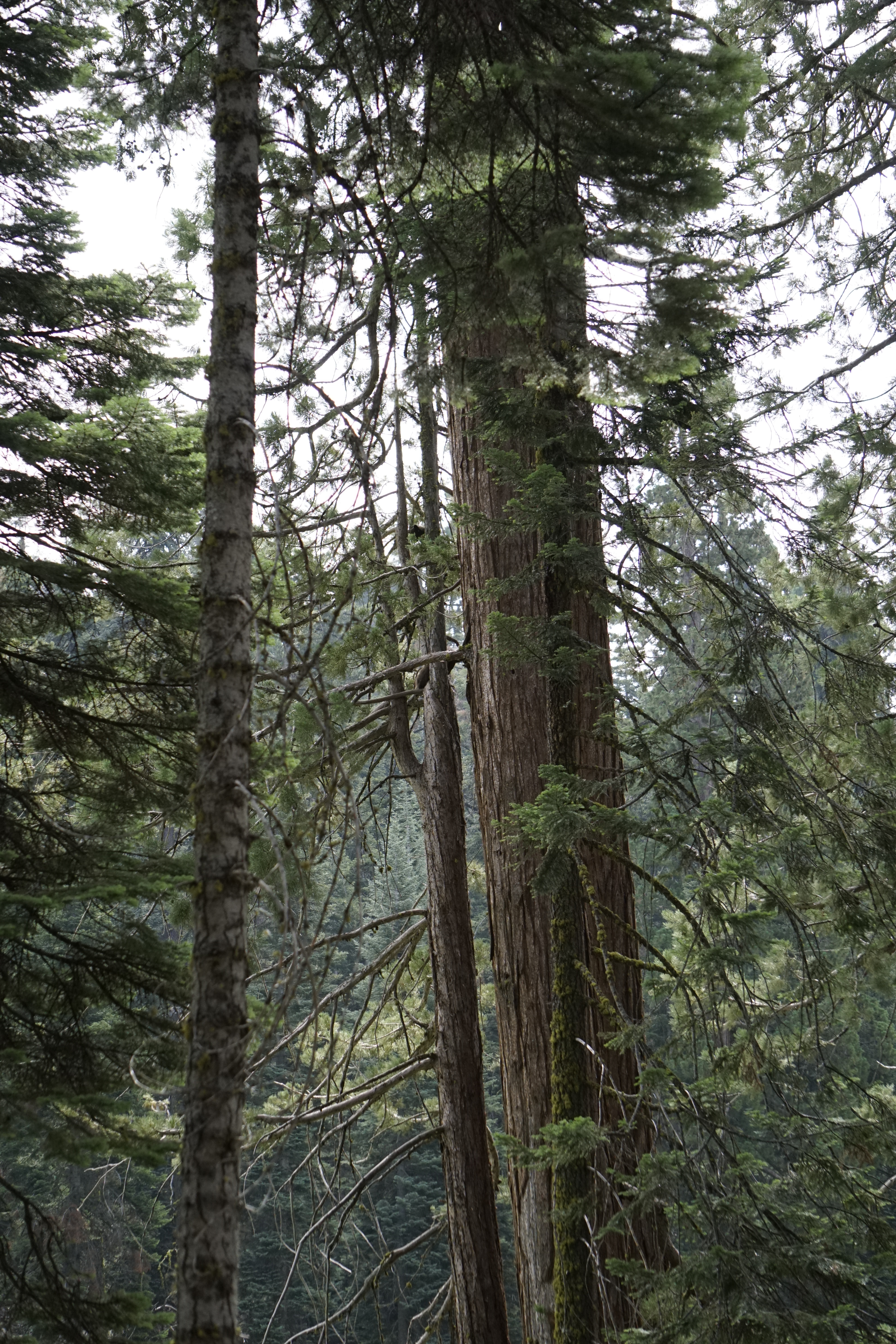 A giant sequoia tree grows in the distance in front of it are smaller moss covered trees.