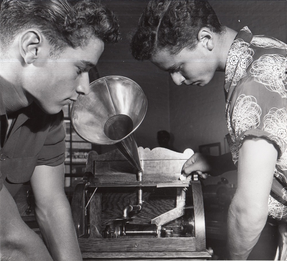 Michael Diamond and Richard Weinick examining coin-operated Edison cylinder phonograph display at Edison Museum.