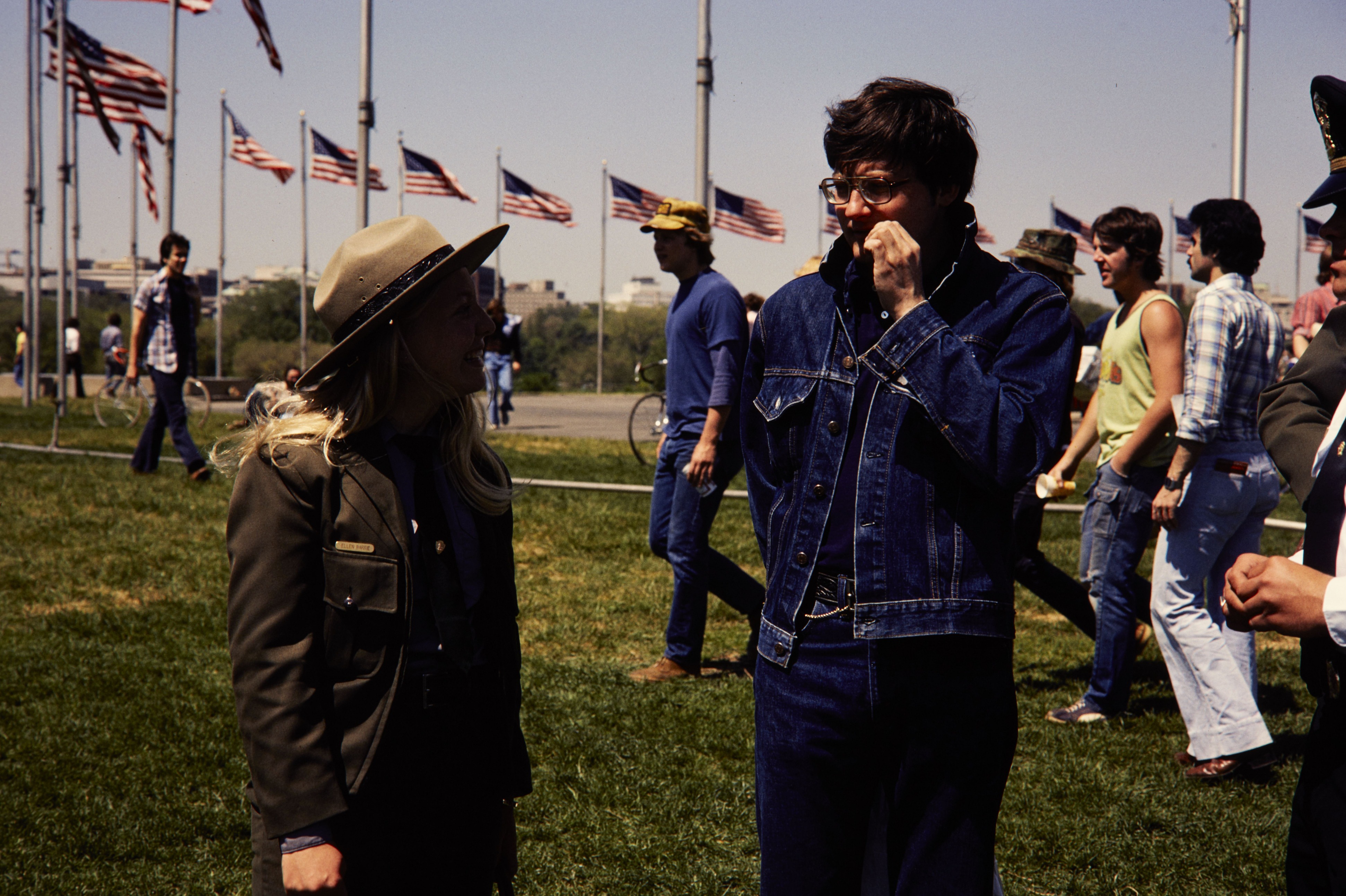 NPS employee, Ellen Barrie, talking to a visitor in front of the Washington Monument in National Mall and Memorial Parks.