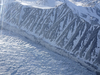 aerial view of a glacier at the foot of a mountain, with trenches in the ice where the glacier and mountain touch