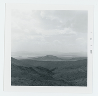 Black and white image of Pinto Backcountry Camp. Northern portion of jeep trail from Mission Well to Old Swede Mine and nearby Pinto Basin camp. Looking South into Pinto Basin.