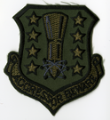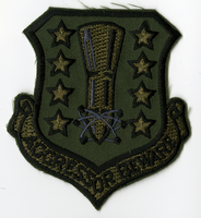 Shield shaped with light blue background and yellow border. Center is yellow, brown, and white nose cone section of missile pointing towards bottom. Nose section has the symbol for atomic science around it. There are four (4) white stars with black edges down each side of the missile. Along bottom is scroll with AGGRESSOR BEWARE" in yellow on white background. Black hook portion of hook & loop fabric on back."