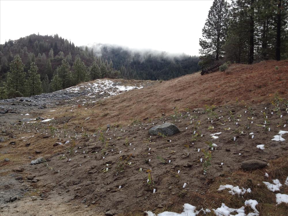 Photographs of seedlings planted in pockets to facilitate the revegetation of the Crystal Creek Rock Quarry within Whiskeytown National Recreation Area. Prior to establishment of Whiskeytown in 1965, a 10.7-mile tunnel was constructed to link Lewiston Reservoir in the Trinity watershed with Whiskeytown Lake in the Clear Creek watershed to supply water to the Central Valley. As a result of tunneling, approximately 350,000 cubic yards of waste rock is stored at the Crystal Creek Quarry site, which covers about 25 acres. Restoration of this site took place between 2010 and 2012.