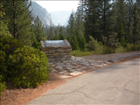 A masonry wayside base and porcelain exhibit panel in the Cedar Grove area of Kings Canyon National Park. It contains messages about the geology of the area.