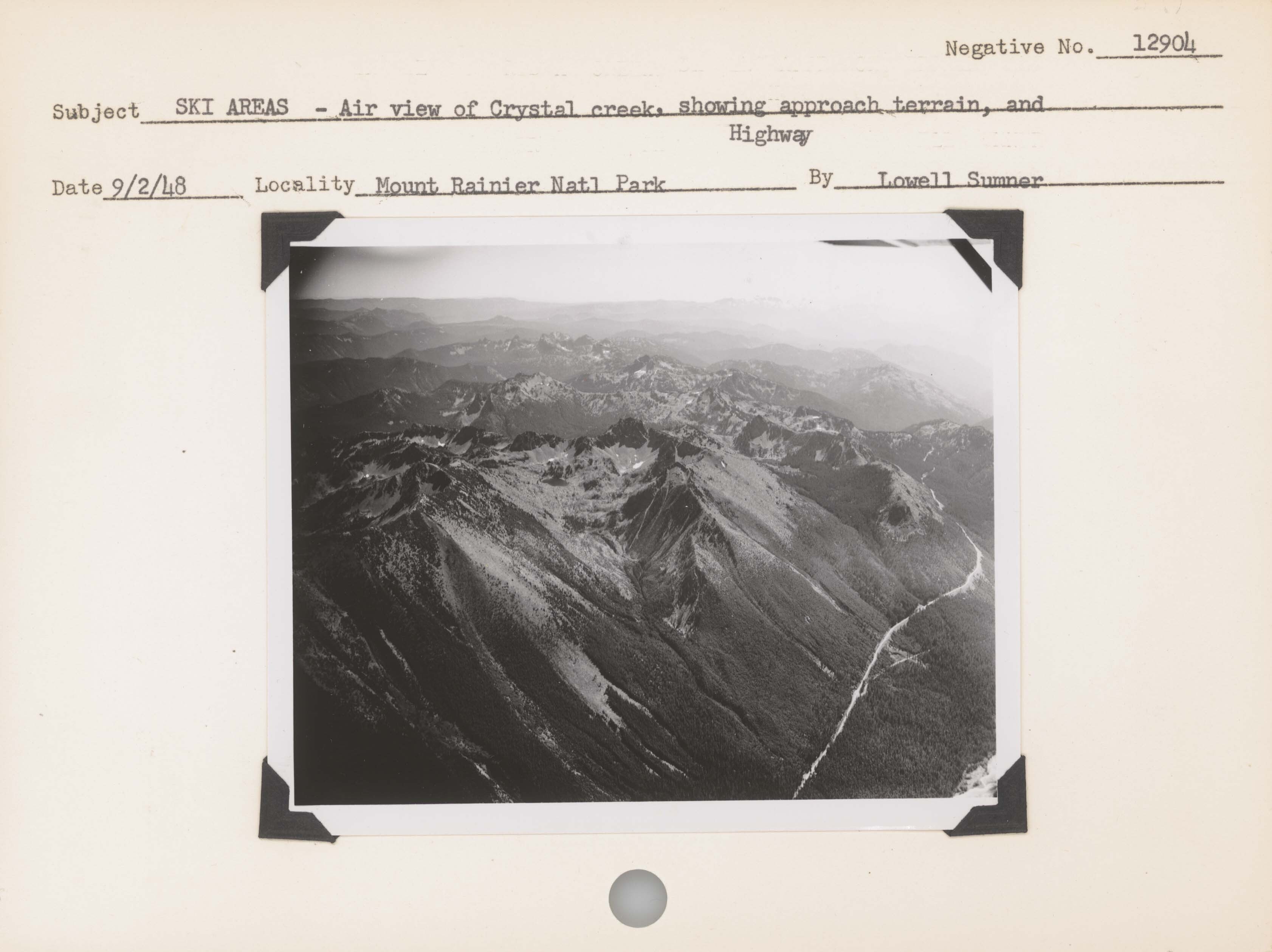 Ski Area – Air View of Crystal Creek, showing approach terrain and Highway. Negative #: 12904. Location: Mount Rainier National Park.