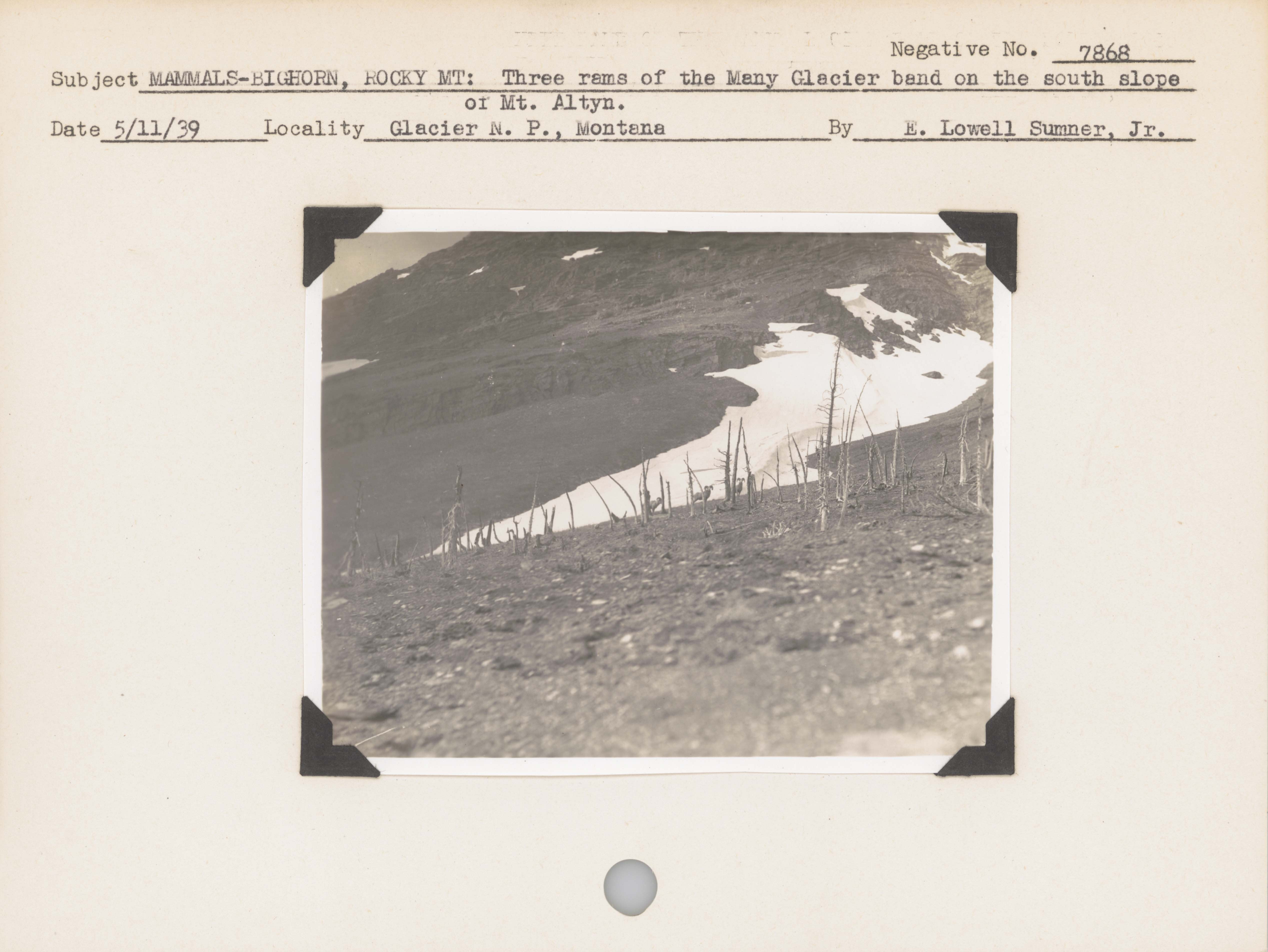 Mammals--Bighorn, Rocky Mountain--Three rams of the Many Glacier band on the south slope of Mount Altyn. Locality: Glacier National Park, Montana. Negative #: 7868