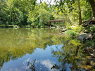 The trail overlooks a quiet stream and bridge on the Sandstone Falls Boardwalk.