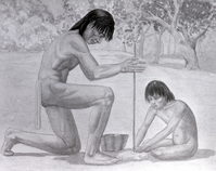 Grinding olive sea shells for Yosemite Native American jewelry. Copy of drawing.