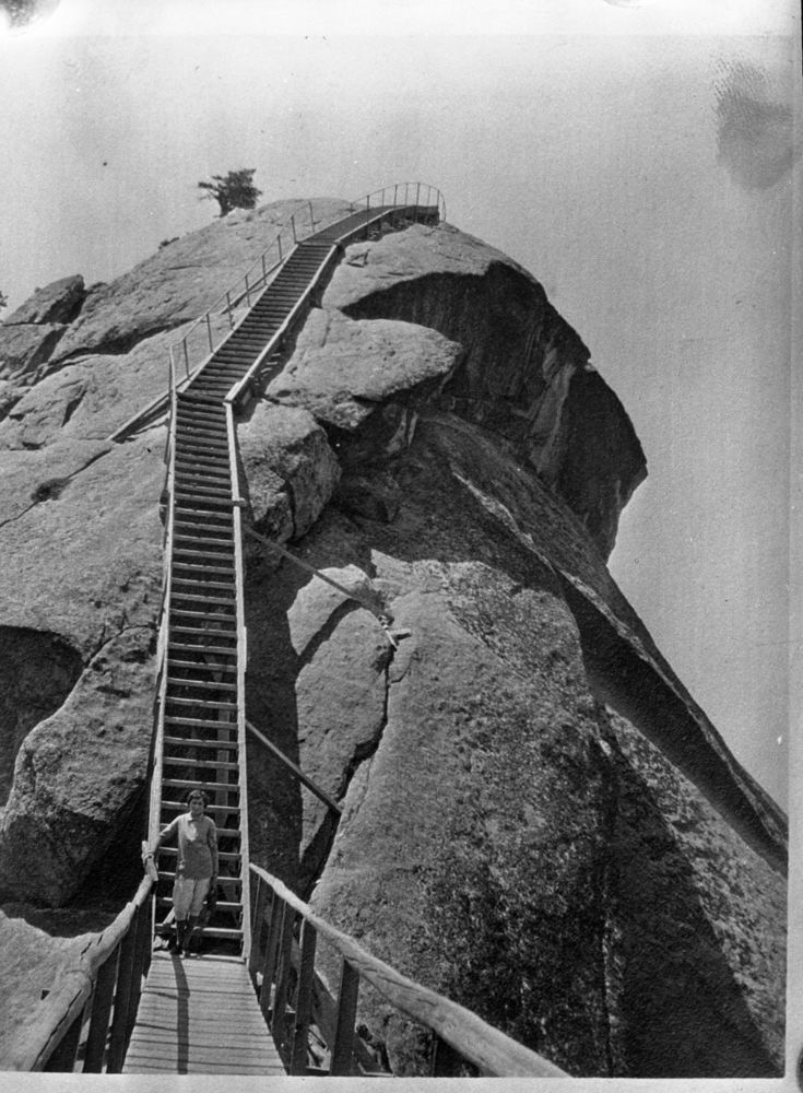 Unknown Photographer, Unknown Date, Giant Forest, SNP, Buildings and Utilities, wooden steps on Moro Rock. Individuals unidentified.