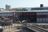 Elevated exterior view of a large train being pulled off a turntable with 10 people looking on. A second train is in a threshold doing the pulling.