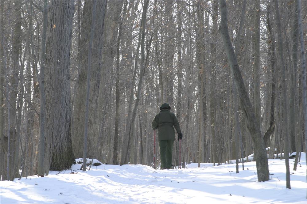 Visitors and park rangers hike on the Stanford Trail in winter.