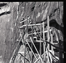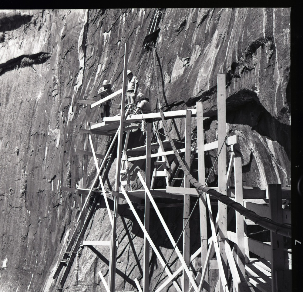 Crews upgrading water system at Temple of Sinawava - scaffolding up cliff face to spring. ; ZION Museum and Archives Image 006_04_157 ; ZION 15933