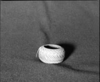 Private Collection. Object: Miwok basket. Dimensions: 5 1/2 x 3 1/4". Materials: Redbud, split shoot that could be bull pine. Technology: Pedestal base was made and attached by two or three stitches. Collection History: Made for the owner when she was a ch