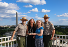 Two female award recipients and two other people pose for a photo on a rooftop.