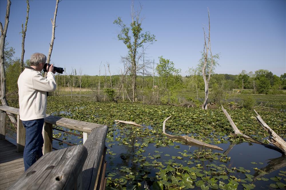 A visitor takes nature photographs at the Beaver Marsh, a site along the Towpath Trail. || Nature photography is a popular activity in Cuyahoga Valley National Park. Cuyahoga Valley Photographic Society promotes CVNP through the photographic arts by providing educational opportunities such as workshops, presentations, photo walks, and an annual photo contest. For more information contact info@cvps.org.
