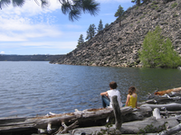 Two kids sitting on logs on the shore of Butte Lake with rocky cliffs to the right and the Fantastic Lava Beds in the background.
