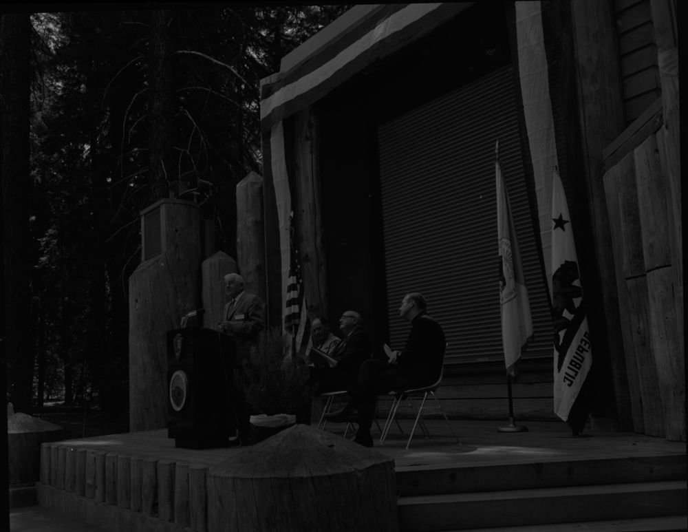 Dedications and Ceremonies, NPS Groups, Park Superintendents. 50th Anniversary of Park Service, Grant Grove Amphitheater. Newton B Drury (speaking), Supt. Frank Kowski, Eivind Scoyen, Father Richard