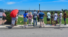 In the foreground, an asphalt road can be seen. An NPS Ranger can be seen presenting a piece of paper while giving an interpretive talk to a group of 13 guests standing on a sidewalk at historic Long Wharf in Cambridge, MD. A light post, the Choptank River, and the Choptank Bridge can be seen in the background.