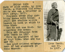 LIBI_00012_07524; A black-and-white photograph of Iron Teeth, age 93, in 1927, walking with cane. Mounted on cardboard. A typewritten inscription to left of picture states: “Indian dice. Made of plum seed, by Iron Teeth, a Cheyenne old woman while she was a prisoner at Fort Keogh [in] 1877. Cheyenne woman play gambling games with these. A small and shallow willow basket is used in which to toss them. Men do not use them. Exclusively for women. This set obtained from iron teeth in 1927. Here is snapshot of her at that time when she was 93…”; print, photographic [mounted on card]; Courtesy of the National Park Service, Little Bighorn Battlefield National Monument, LIBI_00012_07524, Thomas B. Marquis, "Iron Teeth Walking with Cane," 1927