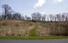 A view of Pardee field before the controlled burn. The Pardee field rock is present in the background. There is a grass path that leads up to the rock.