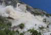 A close perspective of a brown and white dust cloud with boulders actively fragmenting and crashing into the talus slope below.