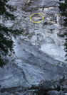 An annotated photo of steep rock cliff indicating the rock fall source area location with a yellow circle.