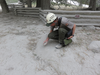 A person bent over, scooping up rock dust that is completely covering the ground around them in a deposit up to 3 cm thick near the base of the talus slope.