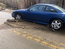 A low-clearance sedan-type vehicle stranded in a mud deposit and abandoned on the road.