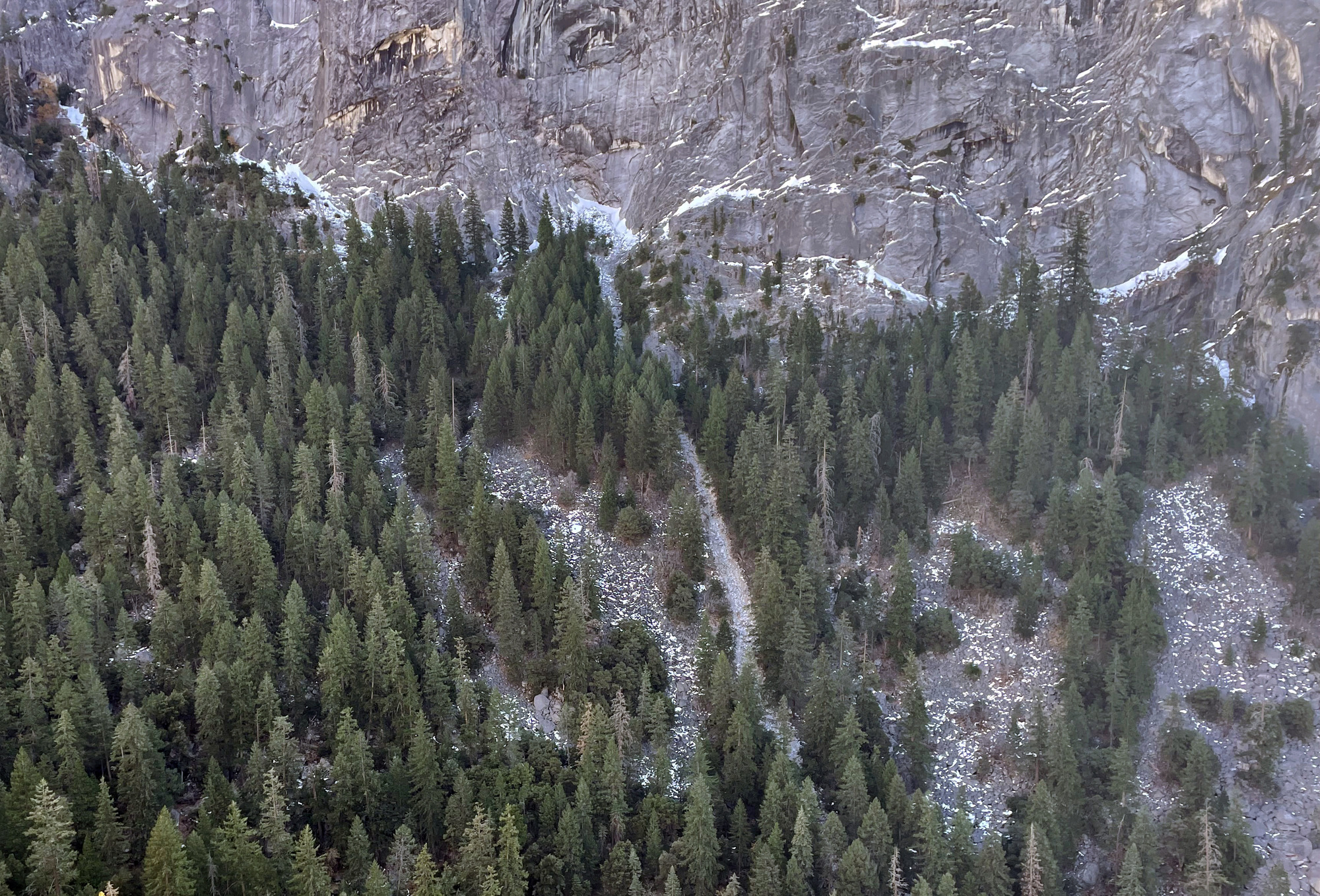 Debris flow path through a forested talus slope (center).