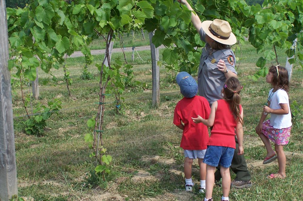 Junior Ranger, Jr. families look for insects in among the grape vines at Sarah's Vineyard. This activity is part of the Butterfly's Breakfast program for children ages 4-6. || CVNP offers a variety of Junior Ranger programs to families and groups during the summer, and a limited menu to families throughout the year. In 2007 we had a Parks as Classrooms grant to develop pilot programs on working farms on park property. This program, Butterfly's Breaksfast, explores the lives of insects and their roles on farms.