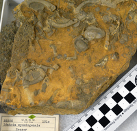 USNM_35225 and USNM_35227: Pictured are multiple trilobite fragments fossilized in the same rock. These are commonly known as hash beds. "Hash" is an indicator of a near-shore environment, where waves could have broken apart trilobite exoskeletons and molts then re-deposited them. These particular “hash” beds are composed of trilobites Idahoia wyomingensis (USNM 35225) and Wilbernia walcotti (USNM 35227). Both samples were collected during the early 1900’s in the northern region of Yellowstone National Park, from an exposed section of the Upper Cambrian (~500 million years ago) Snowy Range Formation.;
