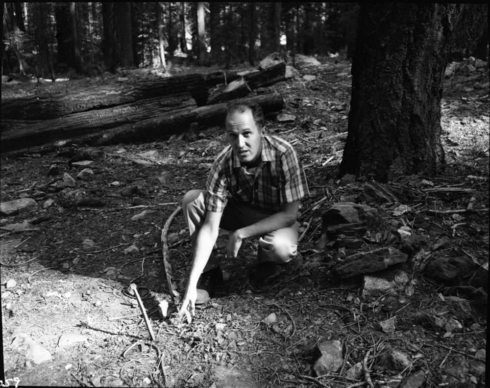 Unknown Photographer, Unknown Date, Redwood Canyon, KCNP, Research Activities, Dr. Howard S. Shellhammer, stakes indicate small Sequoia seedlings growing in soil disturbed in one of the research areas.