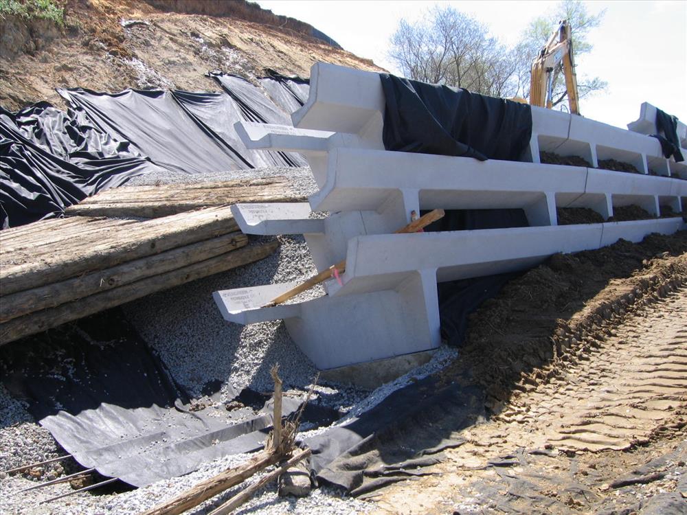 Project included raising the level of riprap around the shoreline of the bluff, constructing an eight foot wide path around the toe of the bluff, constructing a concrete cell wall at the base of the slope, and regarding the top thirty feet of the bluff. The repairs were concentrated along a section of fluff located along the northwest corner of the unit. The repairs generally included raising he height of approximately 650 feet of the existing riprap revetment along the shoreline of the two rivers; removal of vegetation and loose and unstable soil from the toe and face of the bluff; constructing a 450 foot long low height pre-cast concrete retaining wall at the base of the bluff; and then backfilling behind the wall and against the existing slope with an open graded coarse aggregate to control drainage. The top of the wall was built to elevation 16 feet NVGD. A geotextile was used as a filter media to separate the natural soils from the coarse aggregates. The finished slop behind the wall was maintained at a 2 horizontal to 1 vertical slope. An additional 890 tons of riprap was added to the height of the revetment along the project shoreline and thereby provide additional storm protection to the area. The area between the revetment and the retaining was backfilled and a small path was maintained between the toe of the wall and the riprap revetment for public and park access. The finished slope was covered with a geo-cell geo-textile which was filled with topsoil and seeded.