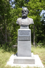 The gray, polished granite monument consists of a 44" square base supporting a rectangular pedestal for a total height of 72". A 36" x 24" x 52" bronze bust rests on top. Two bronze plaques were originally on shaft, but one is missing.