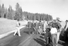 Dedication of Utah State Route 14 approach road. Master of Ceremonies Paul Franke, Zion and Bryce Canyon Superintendent, stands on truck bed and introduces speakers to onlookers in a meadow. Band seated at right. ; ZION Museum and Archives Image 7266 ; ZIO