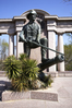 27' x 27' x 14' overall monument is on platform reached by 11 steps and backed by a Doric colonnade, all of red Texas granite. On platform is a 20" x 24" x 84" bronze soldier with a rifle perched on a cannon barrel. Live yucca plants.