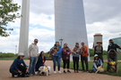 Several dogs and their owners stand with a park ranger outside. The Gateway Arch is in the background.
