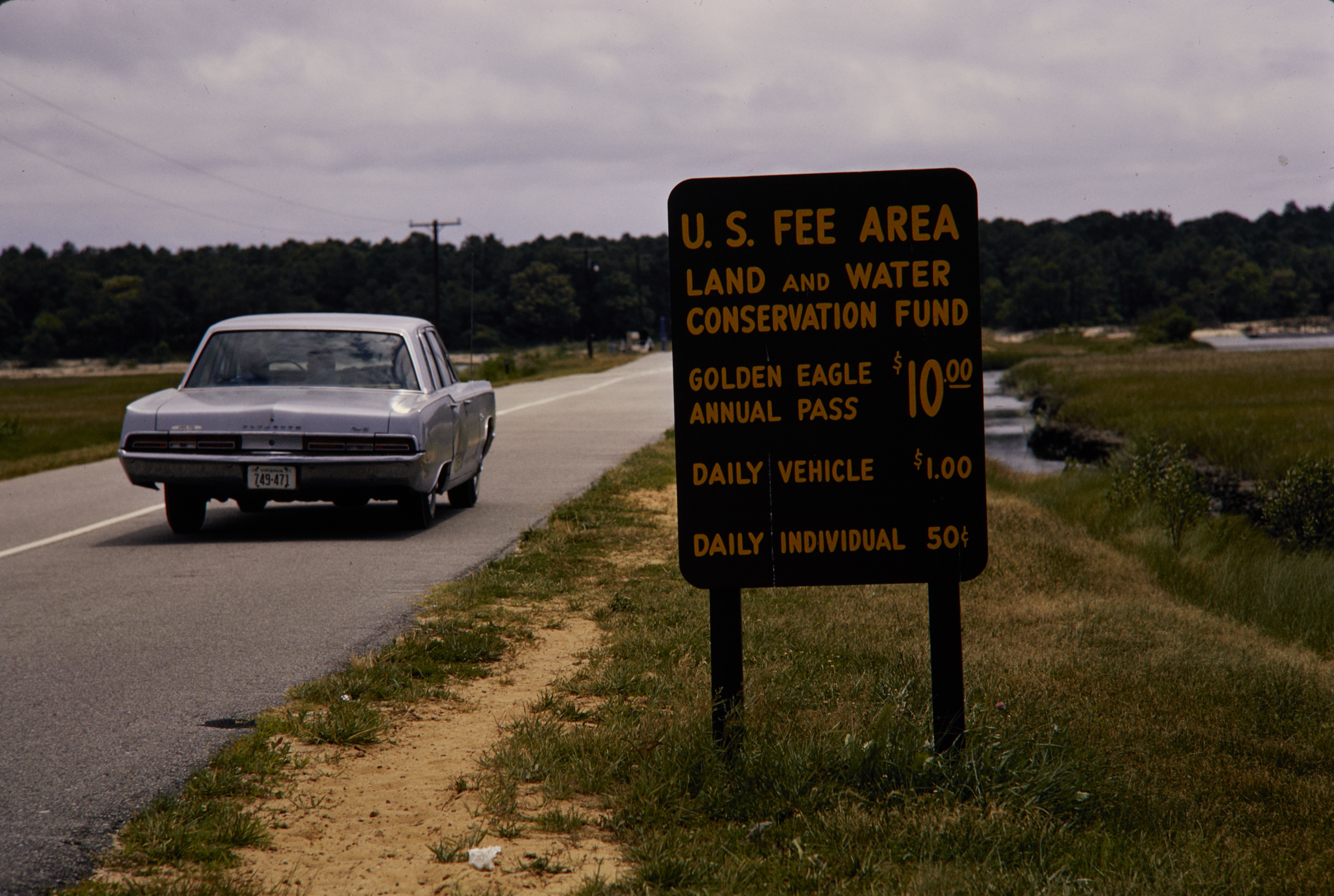 Fee Collection. Entrance fee sign heading into Assateague Island National Seashore.