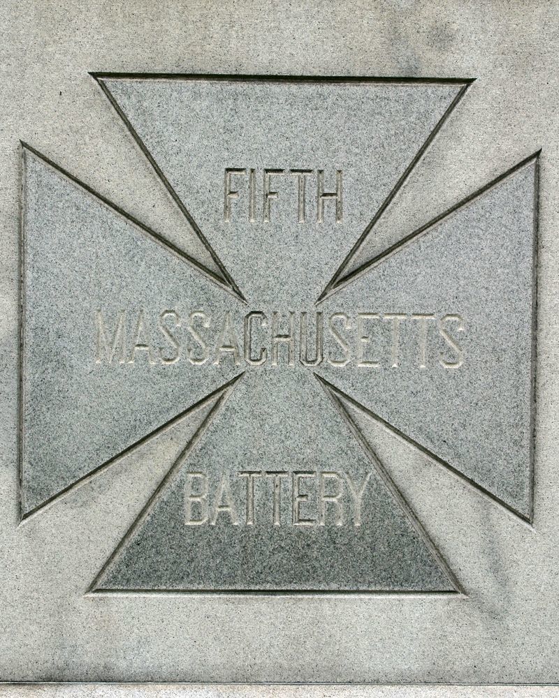 1 of 25 on Park honoring troops from MA. Marks position held by 5 MA Battery on pm of July 2, 1863 where they shelled Confederates near Rose Farm Building & Woods. Located on N of Wheatfield Rd near junction w/ Sickles Ave at Excelsior Field. || MN & 2 cannons. Base, 5'6"x4'7", shaft, 4'x3', 7'3" high. Gable toped w/ chamfered edges. Polished Maltese cross w/ inscription on S, E, W sides. Polished inscription of crossed rammers on front slant of top.