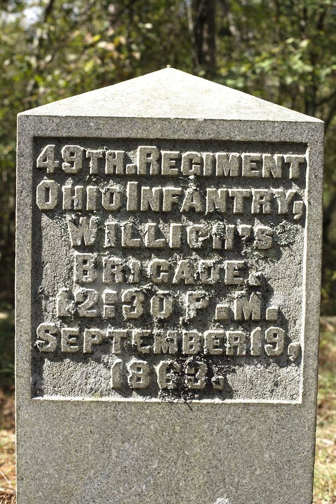 Marker contributes to nat'l significance of park under NR Criterion A because it represents the national movement among veterans & related groups to commemorate Civil War battlefields. || A 1'6" x 1'6" x 3' high granite obelisk with a raised letter inscription. Marks regiment's position on September 19, 1863, at 12:30 p.m.