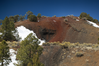 The rusty red El Calderon Cinder Cone Volcano on a sunny winter day, with a few patches of snow on its flanks. This is the most common type of volcano at El Malpais.