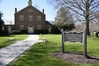 a two-story red brick courthouse stands against a blue sky, green grass, and trees still without their leaves.
